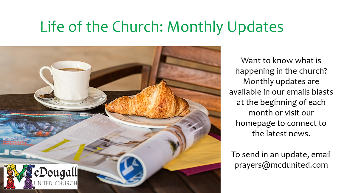 Learn about what is happening at the church. This could be health updates, travel pictures or pictures from past events. Make sure you send your updates in, we want to hear from you!
