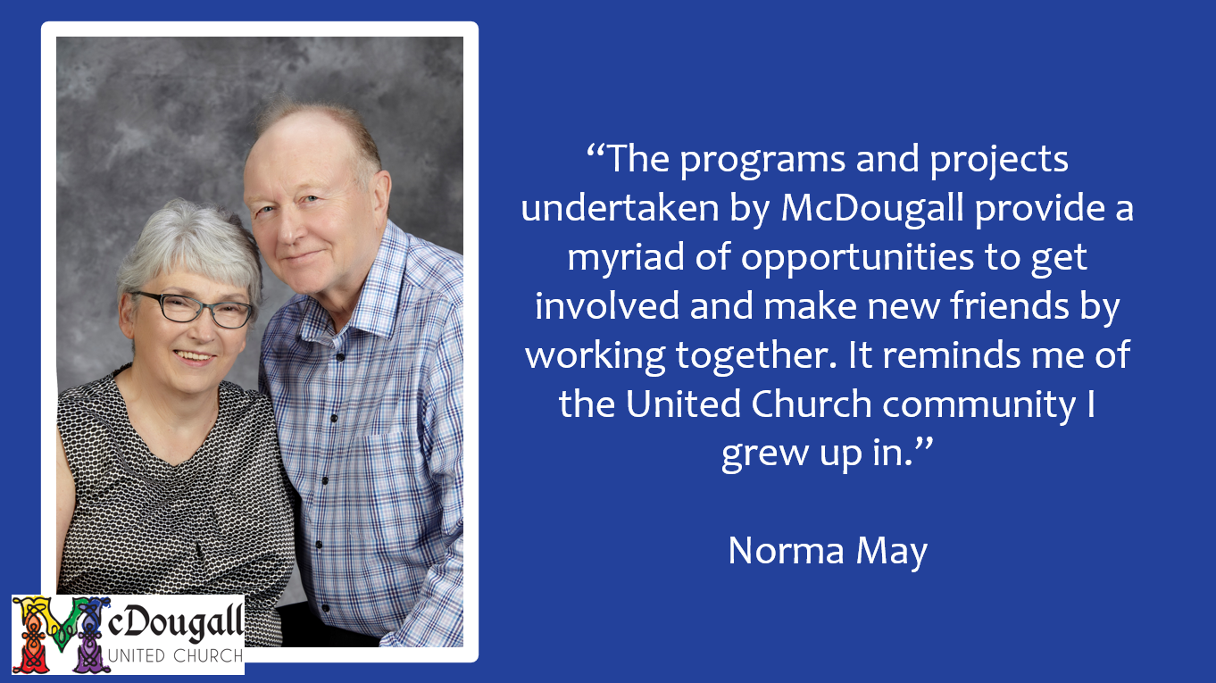 My favorite part of attending McDougall is the opportunity to be part of a caring, open-minded community that addresses the needs of the people not only within the congregation but the wider community. The programs and projects undertaken by McDougall provide a myriad of opportunities to get involved and make new friends by working together.