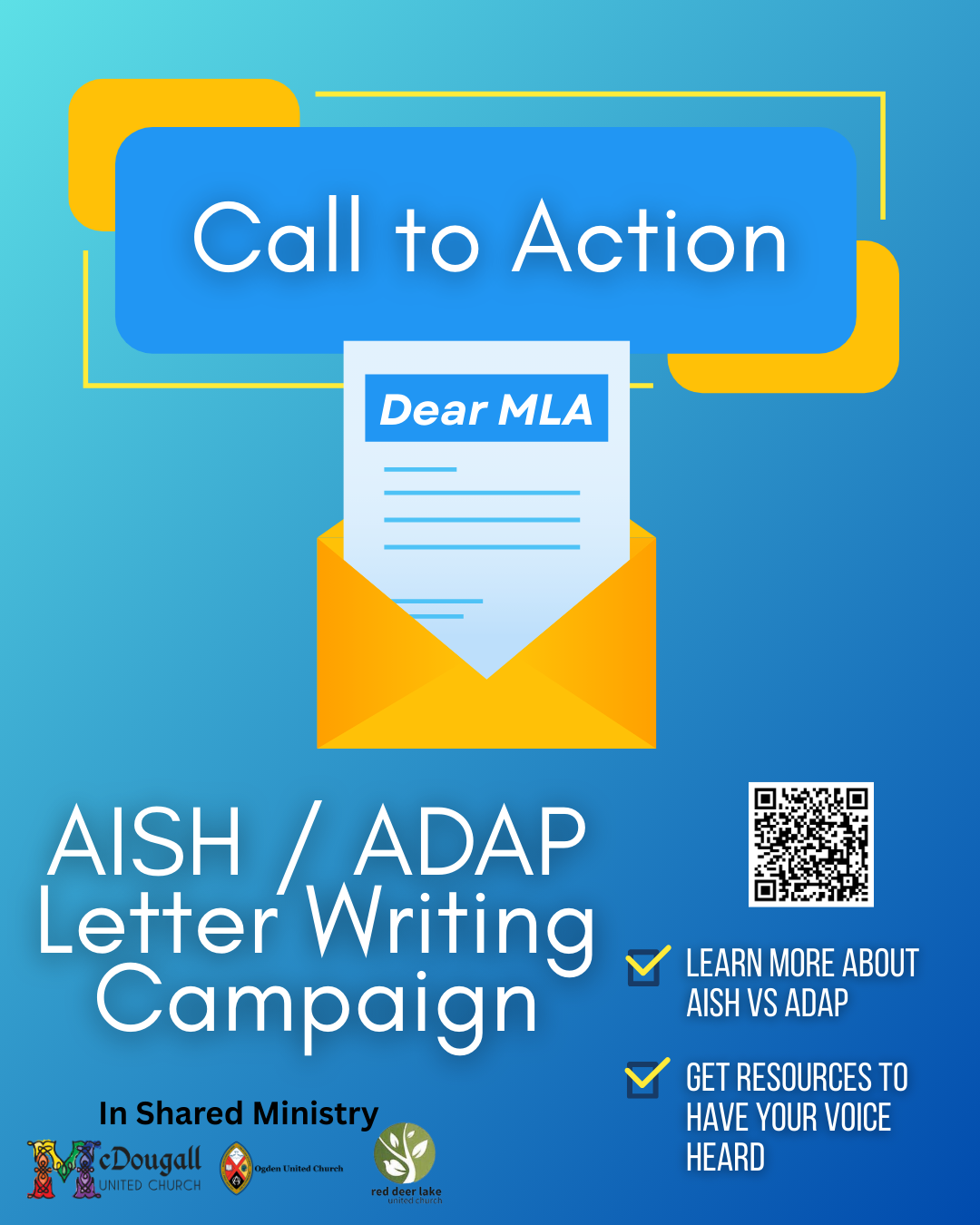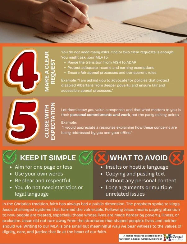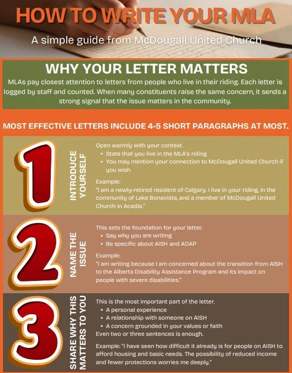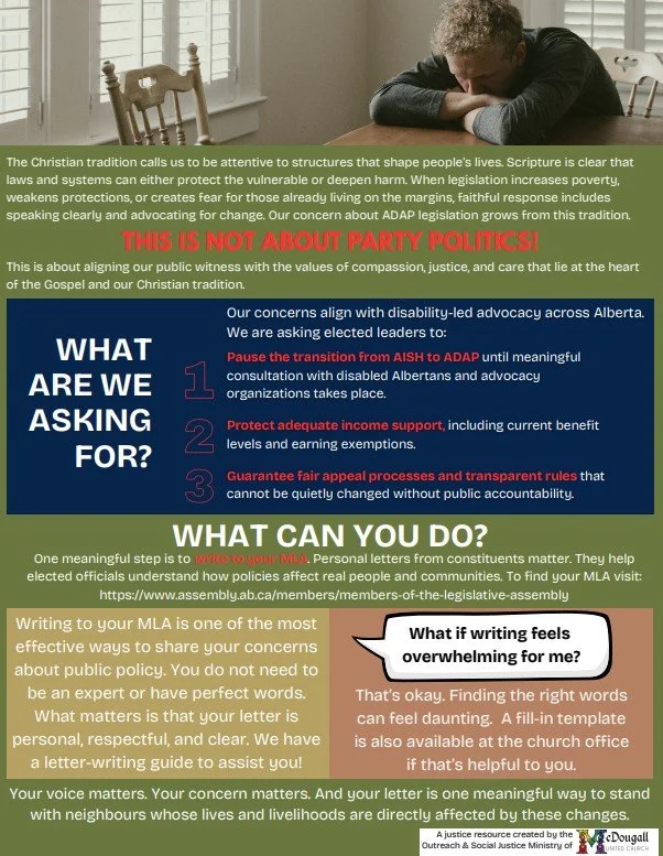 We shared previously a joint statement from the ministry staff and governing boards of McDougall, Ogden, and Red Deer Lake United Churches, standing with disabled Albertans in light of the ADAP legislation (if you missed it, you can read it here). We are encouraging you to take further action and write a letter to your MLA expressing your concerns with the proposed changes. Below is some more information on what the changes are as well as how they will affect disabled Albertans. If you are struggling to read it, feel free to download a copy here. We have also prepared a form letter that you simply have to fill in some information, you can download it here. All of these resources can be found at the church as well.