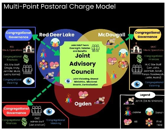 At the September meeting, the JVPG identified the following graphic (below) as the one that best depicts our current vision for the organizational structure for the Shared Ministry Team initiative. In this model, the central leadership group is identified as the Joint Advisory Council for a Multi-point Pastoral Charge that includes, McDougall, Red Deer Lake, and Ogden United Churches.