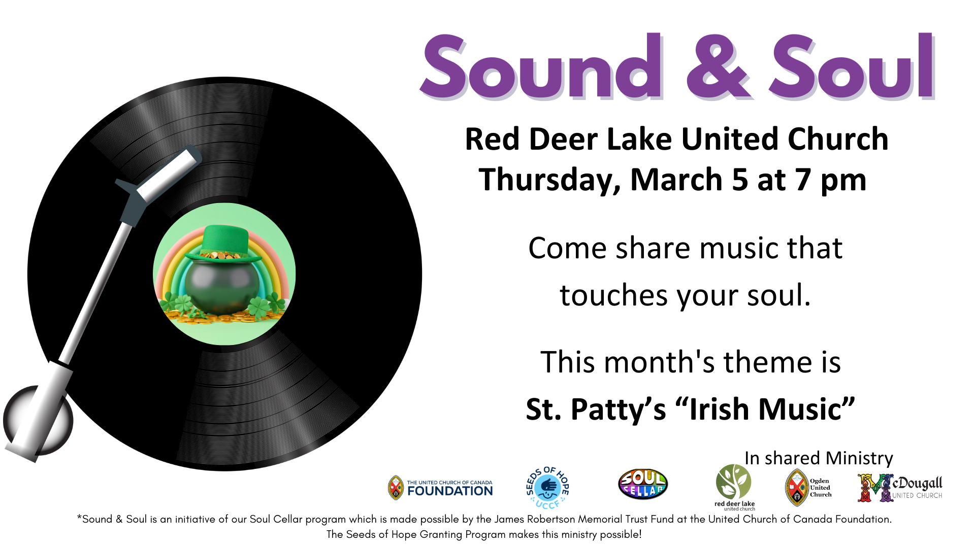 The next Sound & Soul will be held on Thursday, March 5 from 7 to 9 pm at the Red Deer Lake site, in the upper room. This month's theme is: St. Patty's "Irish Music"
