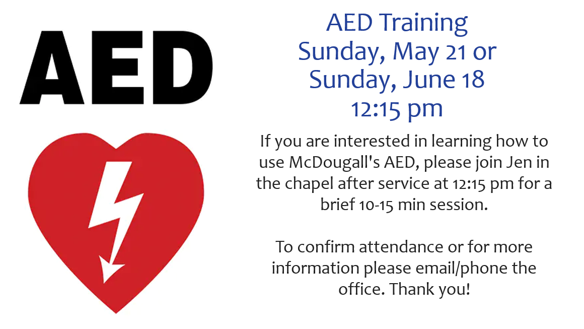 A number of McDougall staff members are certified in first aid but the more people who are aware of and can assist in the use of an AED the better.  If you are interested in learning how to use McDougall's AED, please join Jen in the chapel after service at 12:15 on May 21st and June 18 for a brief 10-15 min session. To confirm attendance or for more information please email/phone the office. Thank you!
