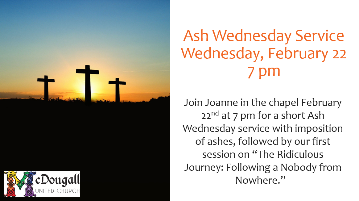 Join Joanne in the chapel February 22nd at 7 pm for a short Ash Wednesday service with imposition of ashes, followed by our first session on “The Ridiculous Journey: Following a Nobody from Nowhere.”