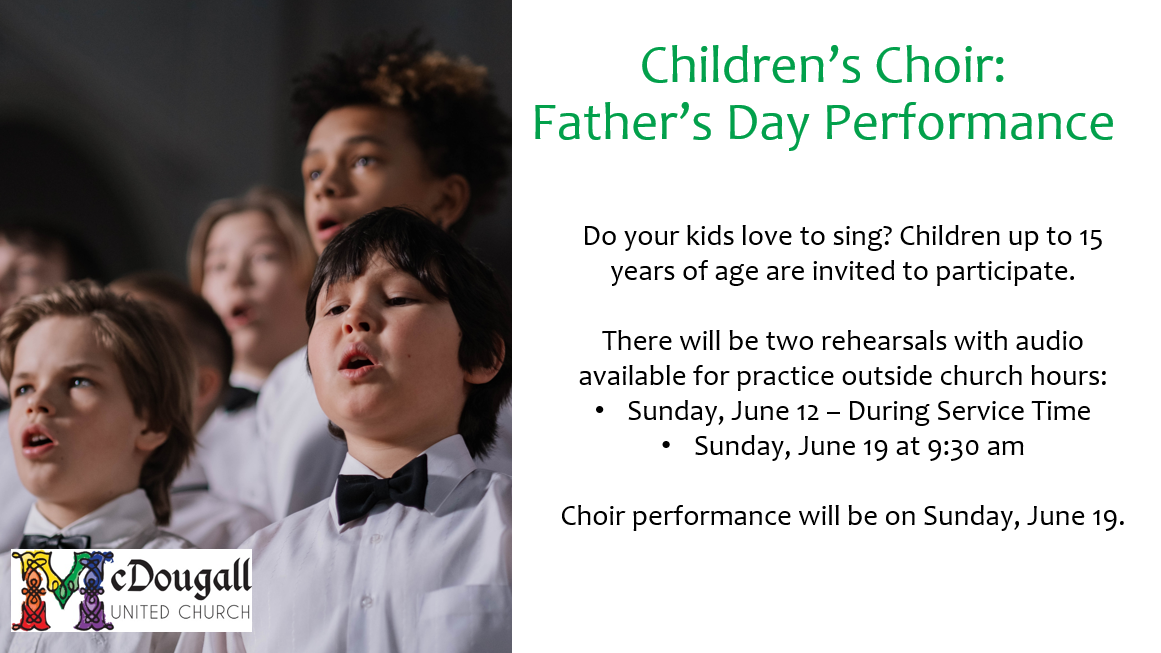 We are having a Children’s Choir perform on June 19th in honor of Father’s Day.