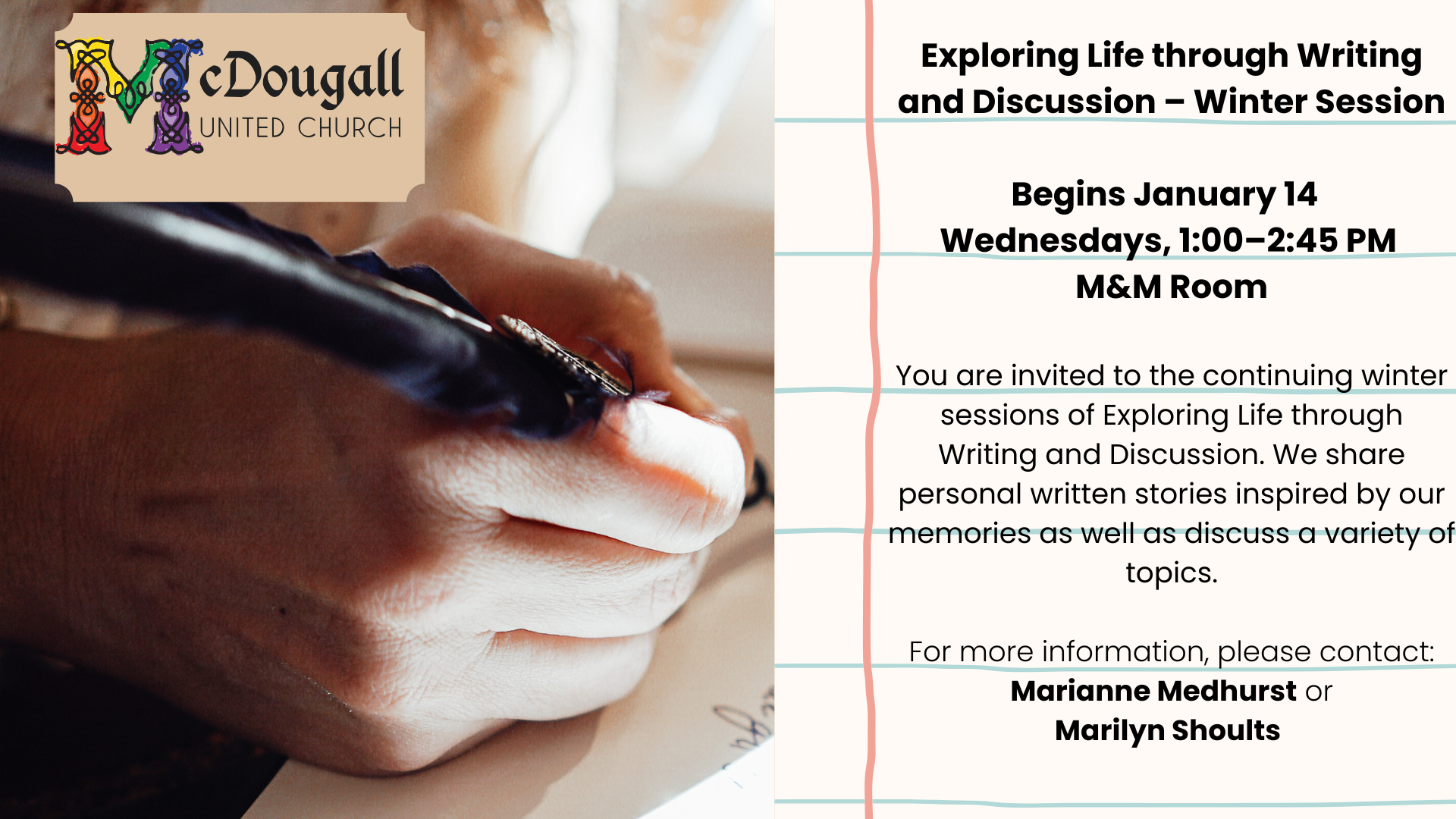 You are invited to the continuing winter sessions of Exploring Life through Writing and Discussion. We share personal written stories inspired by our memories as well as discuss a variety of topics.