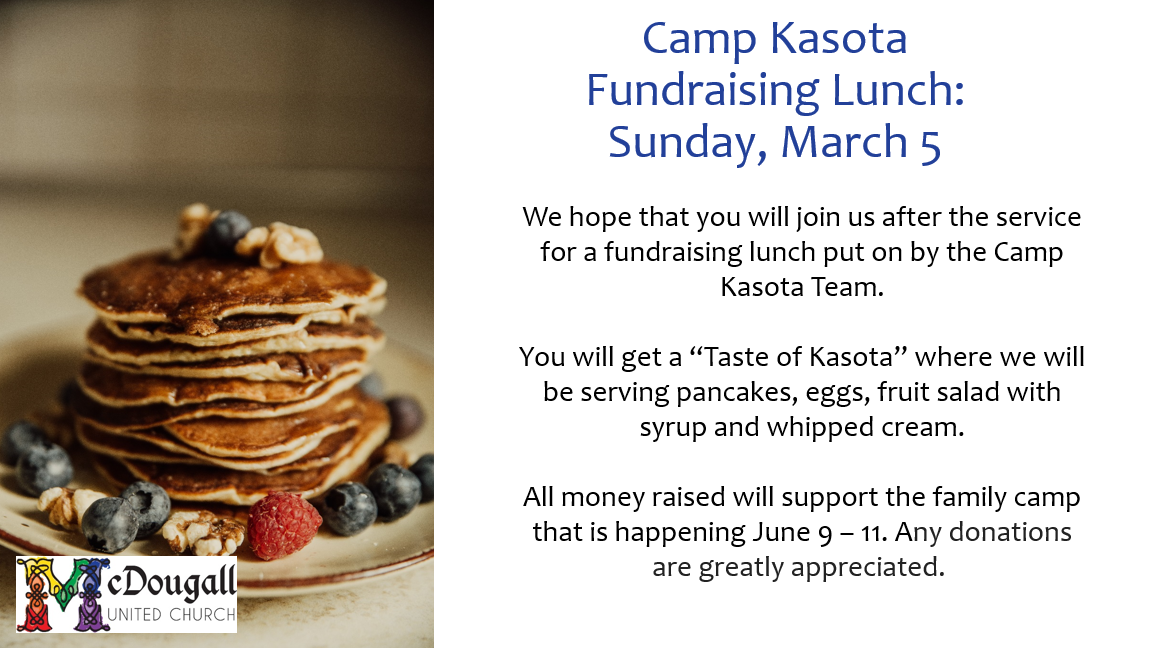 We hope that you will join us after the service for a fundraising lunch put on by the Camp Kasota Team.