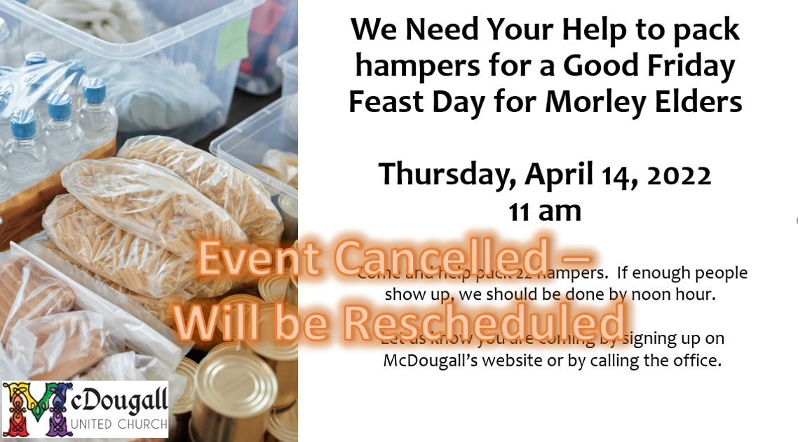 Come and help pack 22 hampers. If enough people show up, we should be done by noon hour.