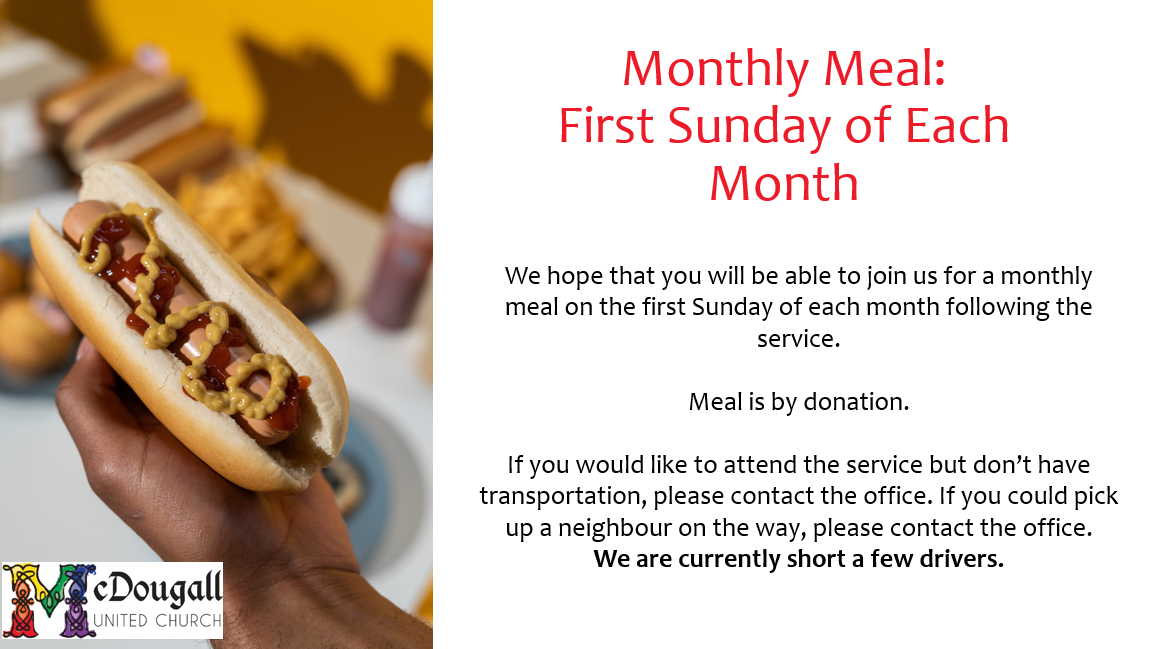 The first Sunday of each month we are trying to connect people who don’t come to church due to not driving with people willing to pick them up (if you are interested in being a driver or being picked up please email Sarah). Many of these people live in retirement homes and they may miss lunch. That said, we will be offering meals following the service once a month. We encourage you to join us in Hospitality Hall following the service.