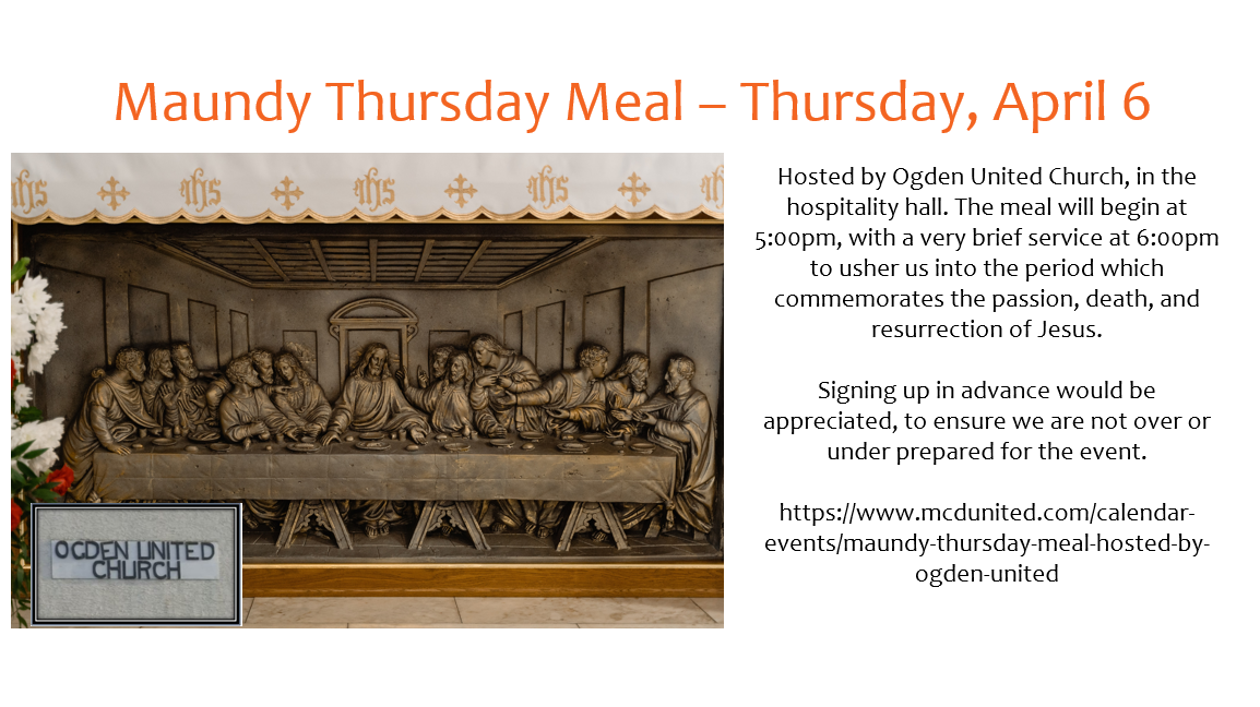 This year, you are invited to join us for a Maundy Thursday meal, hosted by Ogden United Church, in the hospitality hall. The meal will begin at 5:00pm, with a very brief service at 6:00pm to usher us into the period which commemorates the passion, death, and resurrection of Jesus. This period includes Good Friday and Holy Saturday, and ends on the evening of Easter Sunday. A free will offering is welcome, but any and all who want to join in the meal are welcome to attend.