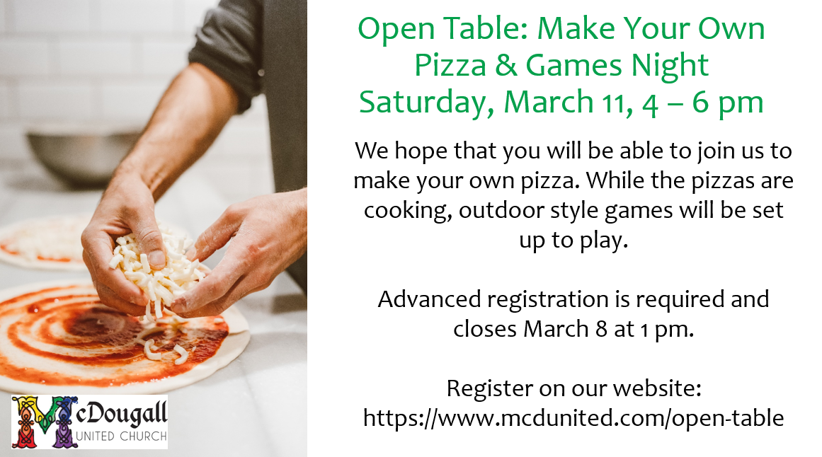 We hope that you will be able to join us to make your own pizza. While the pizza’s are cooking, outdoor style games will be set up to play. Games include: giant bowling, giant connect 4, ball toss, and a basket full of Mega Blocks