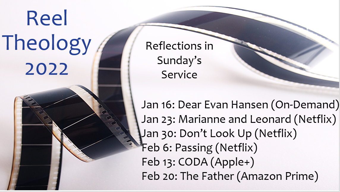 Reel Theology starts on January 16th and runs until February 20. Watch the movies at your convenience and then join us for reflections on Sunday during the service.
