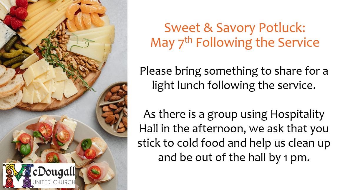 We hope that you will be able to join us for a Sweet and Savory Potluck on May 7th.