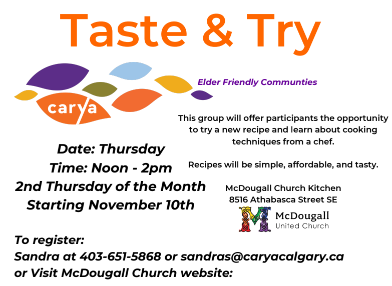 carya Elder Friendly Communities and McDougall Church are partnering to create a place for older adults to come and cook together. We will try some fun recipes and enjoy the results. Rev. Danah Cox will use his chef experience to lead us in a fun cooking experience.